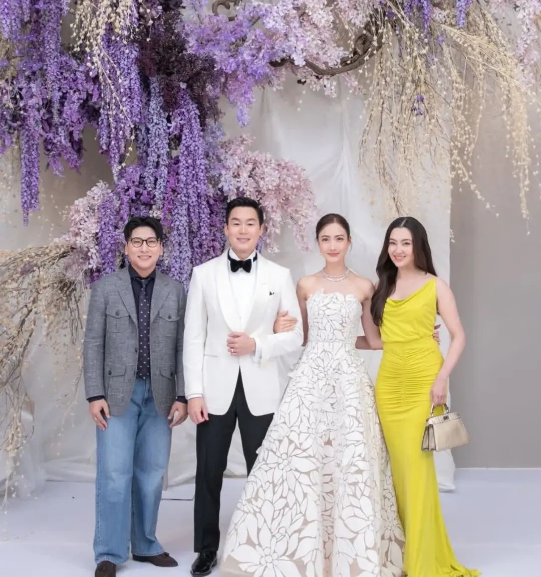 婚礼现场布置得清新雅致,白色纱幔随风轻扬,两张大桌组成简约婚宴。晚宴后的小型派对上,Bella换上白色礼服与丈夫相拥切蛋糕,香港名媛林心儿作为闺蜜全程参与,用手机记录着温馨时刻。